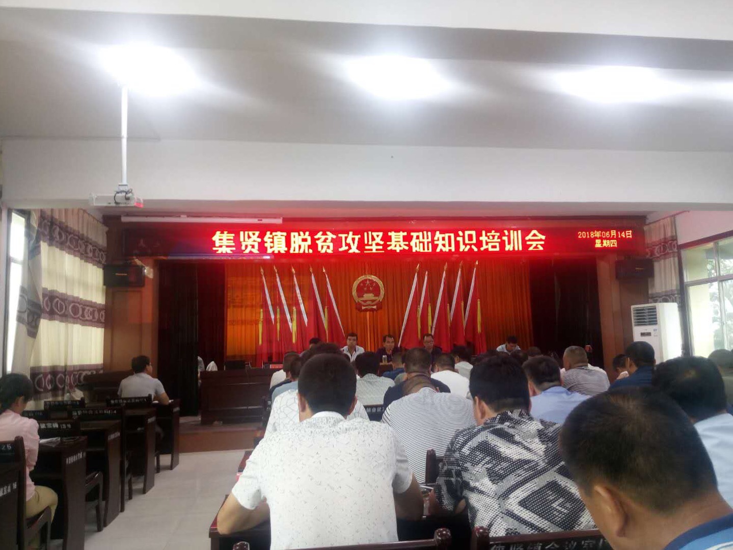 6月14日晚,集贤镇召开脱贫攻坚知识培训会,对全体机关干部、各村双委会负责人、第一书记、驻村工作队长等100余人进行脱贫攻坚知识培训并进行学习成果测试。