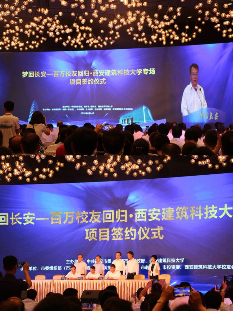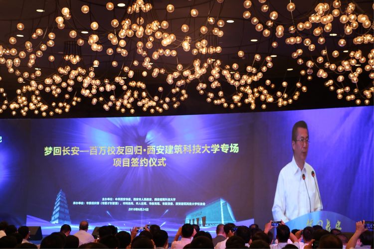 会议由市委常委、副市长高杲主持,西安建筑科技大学党委书记苏三庆致辞、校长刘晓君为校友联谊会授"西安建筑科技大学校友企业家联谊会"牌匾;在项目签约仪式上,王永康书记、上官吉庆市长和苏三庆、刘晓君,中科院院士刘加平见签;随后由签约校友代表,中国冶金科工集团有限公司暨中国冶金科工股份有限公司总经济师刘波发言;最后省委常委、市委书记王永康做总结讲话。